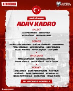 2026 FIFA Dünya Kupası Elemeleri’nde 11 Ekim’de deplasmanda Bulgaristan ve 14 Ekim’de Kocaeli’de Gürcistan’la karşılaşacak A Milli Takım’ın aday kadrosu ve programı açıklandı. Teknik Direktör Vincenzo Montella, kadroya Konyaspor’dan yine futbolcu çağırmadı. Teknik Direktör Vincenzo Montella tarafından aday kadroya 27 futbolcu davet edilirken, bu futbolculardan Barış Alper Yılmaz, 11 Ekim’de oynanacak Bulgaristan-Türkiye karşılaşmasında cezası nedeniyle yer alamayacak. A Milli Takım’a davet edilen oyuncular, 6 Ekim Pazartesi günü saat 12.00’den itibaren TFF’nin Riva’daki Hasan Doğan Milli Takımlar Kamp ve Eğitim Tesisleri’nde toplanacak. Kamp dönemi boyunca tüm antrenmanlarını bu tesiste yapacak Ay-Yıldızlılar, ilk çalışmasını da aynı gün saat 18.00’de gerçekleştirecek.