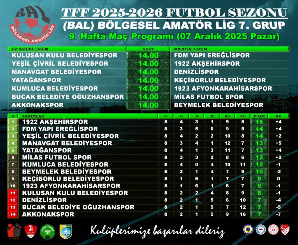 BÖLGESEL Amatör Futbol Lig (BAL) 7 Grup’ta şampiyonluk yarışı 7 Aralık Pazar günü oynanacak 9. hafta maçlarıyla devam edecek. Liderlik koltuğunda oturan Konya temsilcilerinden 1922 Akşehirspor, deplasmanda kendisini 1 puan farkla takip eden Yeşil Çivril Belediyespor ile karşılaşacak. Konya derbisinde ise Kulu Belediyespor sahasında Ereğlispor ile karşı karşıya gelecek. Ligde haftanın programı şöyle…