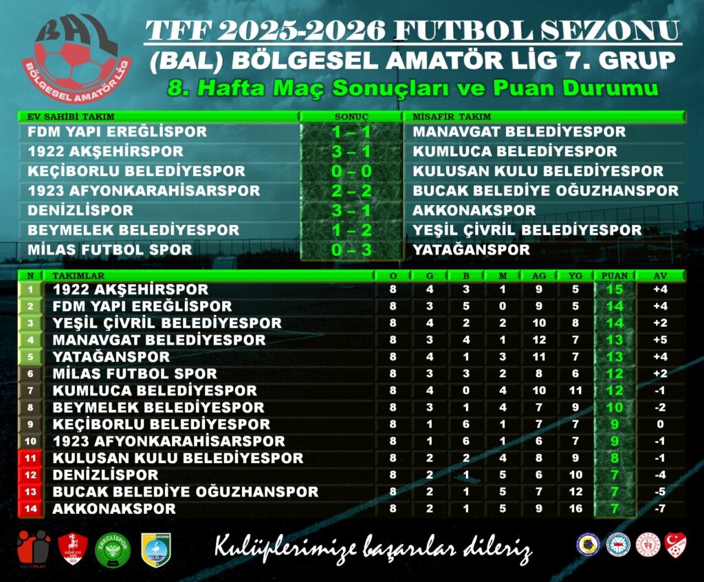 EREĞLİSPOR öne geçtiği maçta galibiyeti koruyamadı ve 14 puanla haftayı ikinci sırada kapattı. Manavgat ekibi ise 13 puanla dördüncü sırada kaldı. Bir diğer Konya ekibi Kulu Belediyespor da deplasmanda Keçiborlu Belediyespor ile golsüz berabere kaldı. Kulu Belediyespor her iki yarıda pozisyonlar bulsa da fileleri havalandıramadı ve zorlu deplasmandan golsüz beraberlikle döndü. Kulu ekibinde 90+1’de Gökhan Göksu ikinci sarı karttan oyundan atıldı. Kulu Belediyespor bu sonuçla 7 puanda kaldı ve düşme hattına indi. Grupta bugün oynanacak maçlarda fileler ise 20 kez havalanırken, şu sonuçlar alındı: Ereğlispor-Manavgat Belediye: 1-1, 1922 Akşehirspor-Kumluca Belediye: 3-1, Keçiborlu Belediye-Kulu Belediye: 0-0, 1922 Afyonkarahisar-Bucak Belediye Oğuzhanspor: 2-2, Denizlispor-Akkonakspor: 3-1, Beymelek Belediye-Y. Çivril Belediye: 1-2, Milas Futbol-Yatağanspor: 0-3.