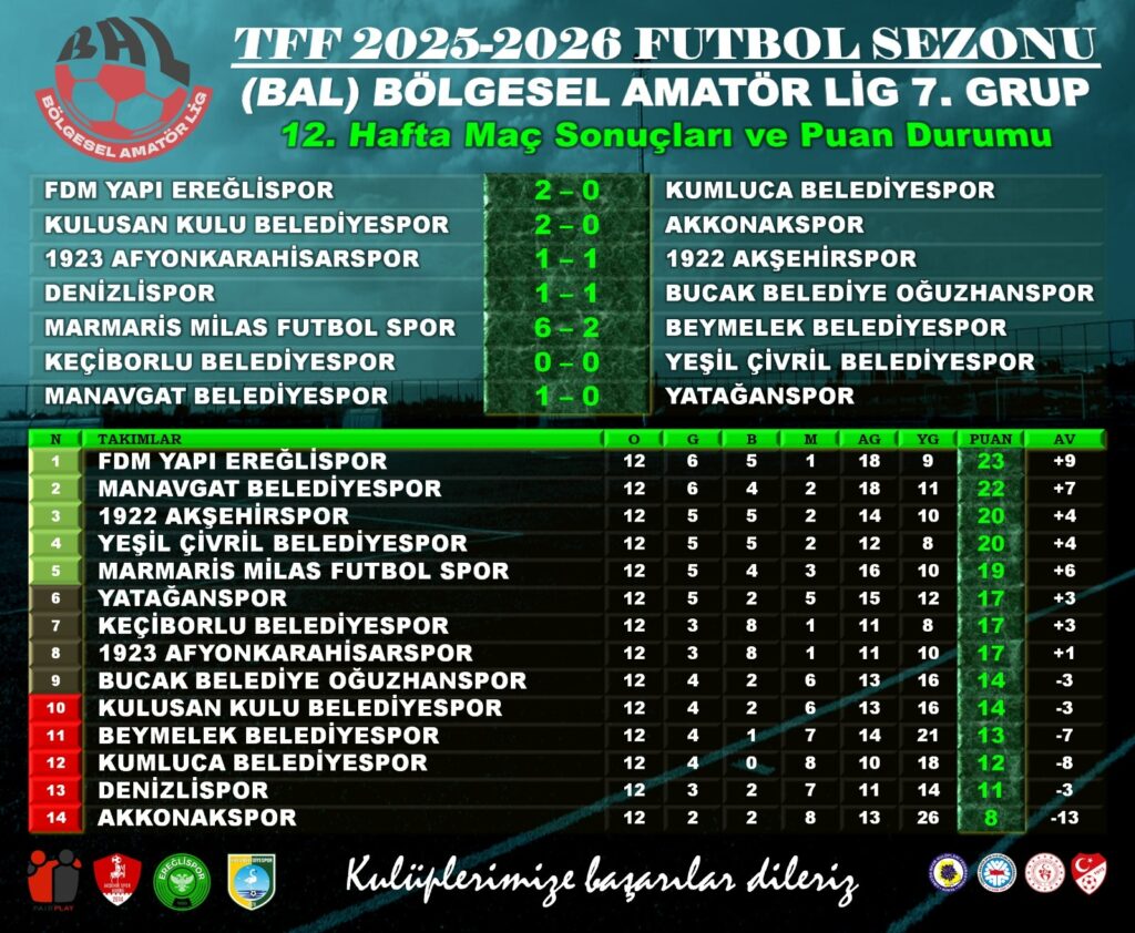 BÖLGESEL Amatör Futbol Lig (BAL) 7. Grup’ta şampiyonluk ve ligde kalma mücadelesi bugün oynanan 12. hafta maçlarıyla devam etti. Konya temsilcilerinden Ereğlispor ve Kulu Belediyespor rakiplerini mağlup ederken, 1922 Akşehirspor ise haftayı 1 puanla kapattı. Liderlik koltuğunda oturan Ereğlispor, sahasında karşılaştığı Kumluca Belediyespor’u 2-0 mağlup ederek liderliğini korudu. Ereğli Atatürk Stadyumu’nda oynanan müsabakanın ilk yarısı golsüz sona erdi. Ereğlispor, ikinci yarıda oyuna ağırlığını koyarken, 58’de Ahmet Baykal’ın golüyle 1-0 öne geçti. 69’da konuk ekipten Mustafa Öztürk ikinci sarıdan kırmızı kart görerek 10 kişi kaldı.