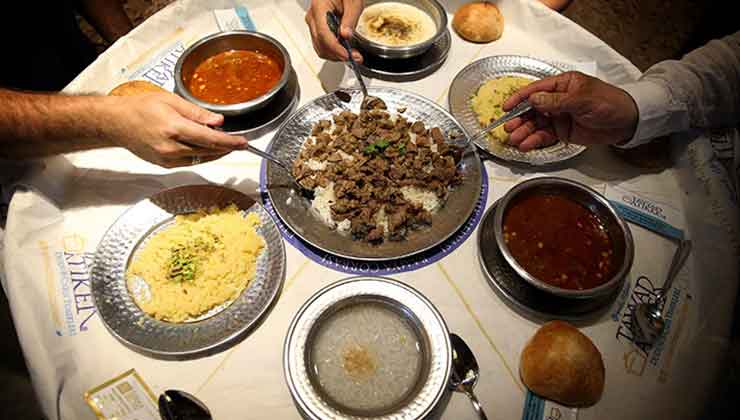 Etrafında tabure ya da sandalye bulunan yuvarlak tahta masa sofralara on kişi birden oturulur. Mis gibi yoğurt çorbası ile başlanır yemeğe ve herkes aynı tasa, tabağa kaşık sallar. Devamında sofra sakinleri “tamam artık getirme” diyene kadar bilmem kaç kayık tabağı pilav üzerinde kebap tadında kuşbaşı et ve ardından irmik helvası ile bilmeyenler tam yemek bitiyor diye düşünürken ateş gibi sıcak bamya çorbası iner masaya. Sonrasında yine pilav üzeri et ve zerde tatlısının yanı sıra meyve suyu ikramı ile dua edilip kalkılır sofradan.