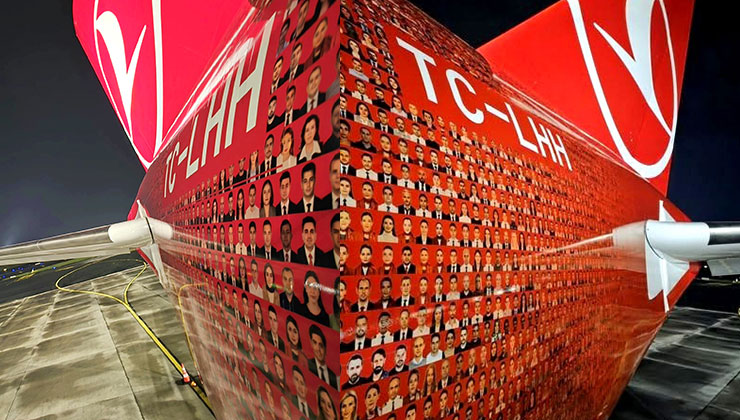 Türk Hava Yolları (THY), filosundaki uçak sayısını 500’e çıkararak tarihi bir başarıya ulaştı. Airbus’tan teslim alınan TC-LHH tescilli A350 tipi uçak, şirketin başarısında emeği olan tüm çalışanların fotoğraflarından oluşan çok özel bir boyamayla (livery) kaplandı. Bayrak taşıyıcı gururumuz olan Türk Hava Yolları, gün geçtikçe gururlandırmaya devam ediyor. Filoya katılan 500. uçak olma özelliğini taşıyan Airbus A350-900, sadece teknolojisiyle değil, gövdesindeki anlamlı tasarımla da dikkat çekiyor. Fransa’nın Toulouse kentindeki Airbus tesislerinden havalanarak İstanbul Atatürk Havalimanı’ndaki THY Teknik hangarlarına getirilen TC-LHH tescilli uçak, burada hummalı bir çalışmayla “aile fotoğrafına” dönüştürüldü.