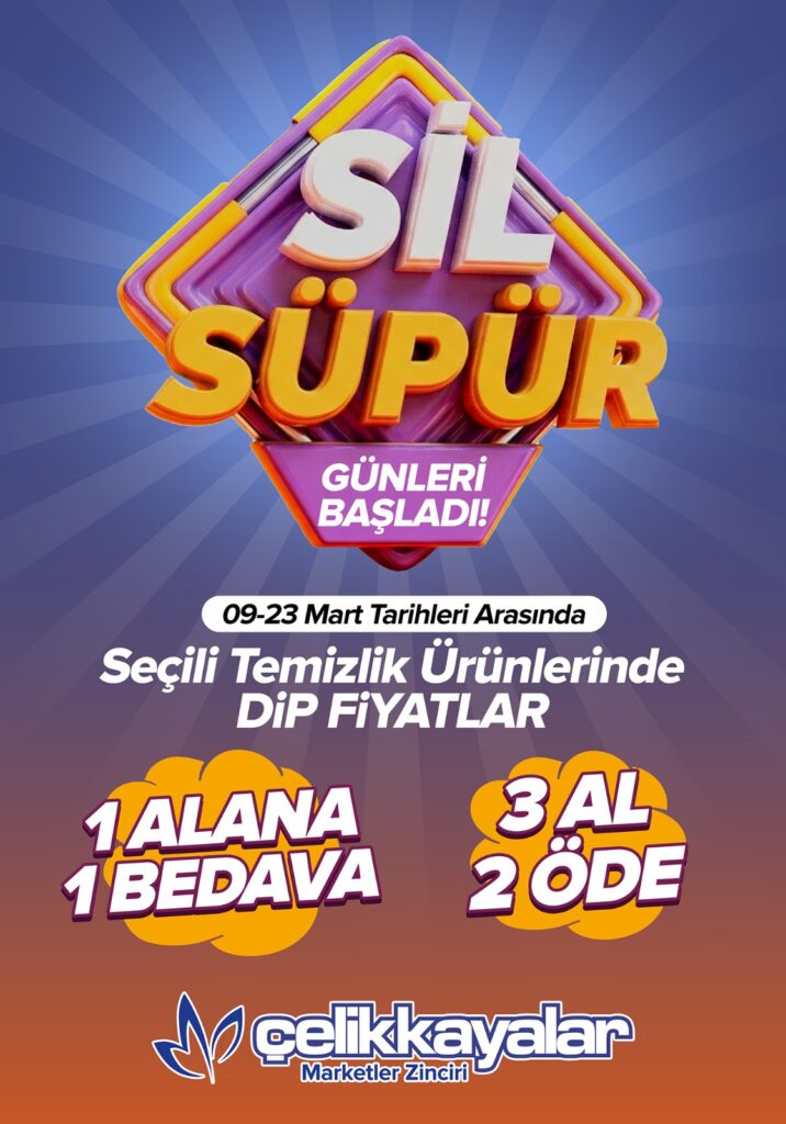 Çelikkayalar Marketler Zinciri, yaklaşan bayram ve bahar temizliği hazırlıkları kapsamında 9–23 Mart tarihleri arasında tüm mağazalarında “Sil Süpür” kampanyasını başlattı. Kampanya kapsamında birçok temizlik ürününde 1 alana 1 bedava fırsatları ve dip fiyatlı ürünler müşterilerle buluşuyor.