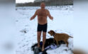 Karlı havaya aldırış etmeden köpeğiyle beraber denizde yüzdü