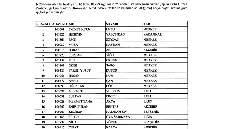 20 Nisan 2025 tarihinde yazılı, 18 – 29 Ağustos 2025 tarihleri arasında sözlü bölümü yapılan Gelir Uzman Yardımcılığı Giriş Sınavı sonucu açıklandı Konya’dan ise sadece 20 kişi sınavda başarıya ulaştı.