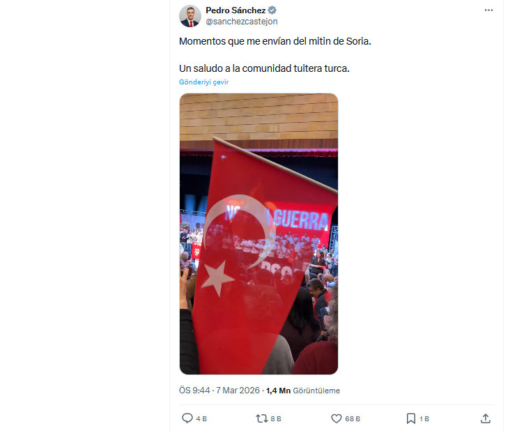 Sanchez paylaşımda, İspanya’nın Soria kentinde düzenlenen bir mitingde Türk bayrağının sallandığı anlara ait görüntülere yer vererek, “Soria mitinginden bana gönderilen görüntülerden biri. Türk sosyal medya topluluğuna selamlar olsun” ifadelerini kullandı.
