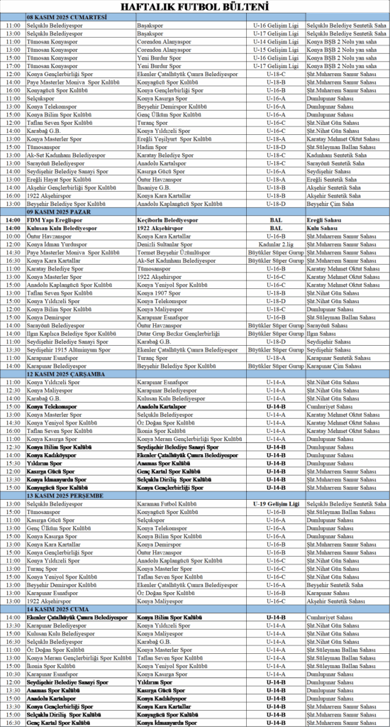 KONYA futbolunda hafta sonu dolu dolu geçecek. Bölgesel Amatör Lig’de (BAL) Kulu Belediyespor ile 1922 Akşehirspor karşılaşacak. Ereğlispor, Keçiborlu Belediyespor’u ağırlayacak. Konya Amatör Süper Grup’ta 3. hafta maçları oynanacak. Kadınlar 2. Ligi’nde Konya İdmanyurdu, Denizli Sultanspor’u ağırlayacak. Konyaspor’un gelişim takımları, sahasında Alanyaspor ve Yeni Burdurspor ile karşılaşacak. Amatör U18 ve U16 Liglerinde heyecan bugün ve yarın yapılacak maçlarla sürecek. Ayrıca bu liglerde hafta içi maçları da oynanacak. Konya futbolunda haftanın programı şöyle…