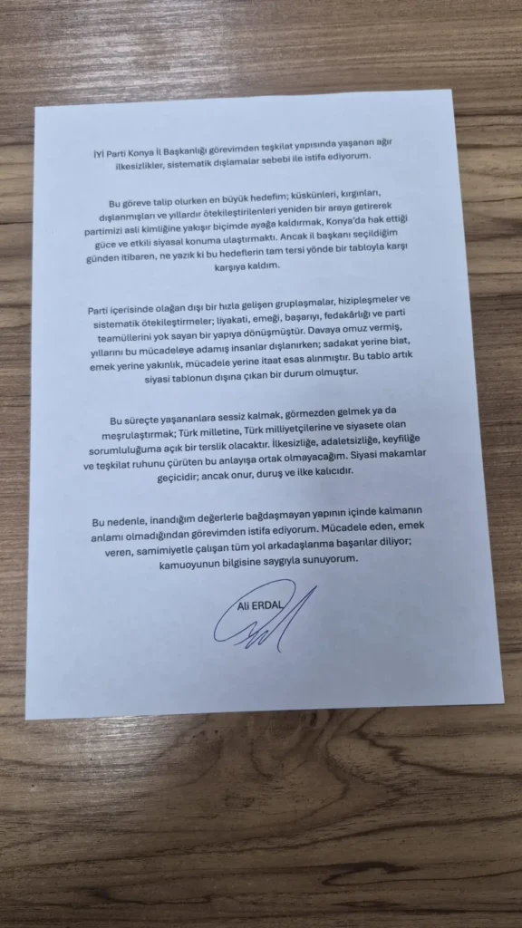 İYİ Parti Konya İl Başkanı Ali Erdal, parti teşkilatı içinde yaşandığını ifade ettiği ilkesizlikler, sistematik dışlamalar ve hizipleşmeler nedeniyle görevinden istifa ettiğini açıkladı.