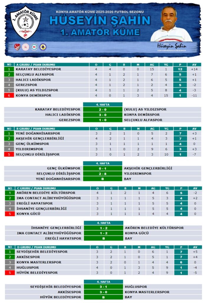 KONYA Amatör 1. Küme Futbol Ligi’nde heyecan dün oynanan 4. hafta maçlarıyla sürdü. A Grubu’nda 4’te 4 yapan Karatay Belediyespor 12 puanla zirvede. B Grubu’nda ise 3’te 2 ile 7’şer puanlı Yeni Doğanhisarspor ve Akşehir Gençlerbirliği liderlik koltuğunu paylaşıyor. C Grubu’nda 6 puanlı Akören Belediyespor ve D Grubu’nda da Seydişehir Belediyespor ve Akkikespor zirvede yer alıyor. Yeni Doğanhisarspor, Ereğli Belediyespor ve Hüyük Belediyespor haftayı fikstür gereği maç yapmadan (BAY) geçirdi. Ligde dün 4 grupta oynanan 9 karşılaşmada fileler 28 kez havalandı.
