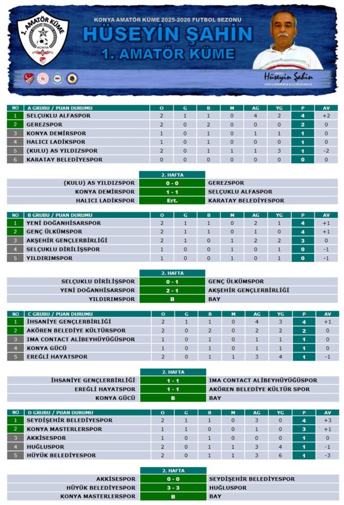 KONYA Amatör 1. Küme Futbol Ligi’nde ikinci hafta geride kaldı. Pazar günü oynanan maçların ardından A Grubu’nda yer alan Selçuklu Alfaspor 4 puanla zirvede yer alıyor. Bu grupta Halıcı Ladikspor-Karatay Belediyespor maçı olumsuz hava koşulları nedeniyle ertelenirken, grupta Selçuklu Alfaspor dışında kazanan takım bulunmuyor. B Grubu’nda 2 maçta 4’er puan alan Yeni Doğanhisarspor ve Genç Ülkümspor liderliği paylaşıyor. C Grubu’nda İhsaniye Gençlerbirliği 4 puanla zirvede. Bu grupta da İhsaniye dışında diğer takımlar galibiyet sevinci yaşayamadı. D Grubu’nda ise Seydişehir Belediyespor 4 puanla liderlik koltuğunda otururken, 3 puanlı Konya Masterlerspor lideri izliyor. Ligde bu hafta oynanan 8 karşılaşmada fileler 16 kez havalandı ve 2 maçta gol sesi çıkmadı.