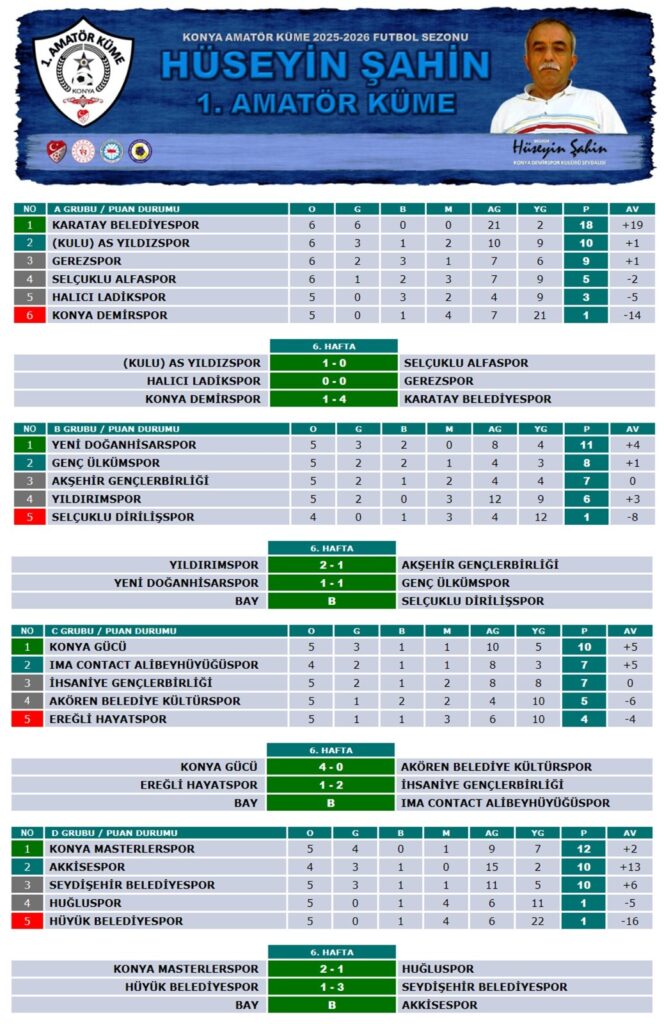 KONYA Amatör 1. Küme Futbol Ligi’nde heyecan pazar günü oynanan 6. hafta maçlarıyla devam etti. 6. hafta sonunda 3 takım yenilgi yüzü görmedi. A Grubu’nda Karatay Belediyespor, B Grubu’nda Yeni Doğanhisarspor ve D Grubu’nda ise Akkisespor yenilgi almadılar. Karatay Belediyespor’un 6’da 6 ile zirvede yer aldığı A Grubu’nda liderin en yakın takipçisi 8 puan farkla Kulu As Yıldızspor. Bu grupta Halıcı Ladikspor ve Konya Demirspor ise henüz 3 puan sevinci yaşayamadılar. B Grubu’nda Yeni Doğanhisarspor 3 puan farkla zirvede. Genç Ülkümspor ve Akşehir Gençlerbirliği lideri izliyor. Bu grupta Selçuklu Dirilişspor’un galibiyeti bulunmuyor. C Grubu’nda Konyagücü 10 puanla liderlik koltuğunda oturuyor. 7’şer puanlı Alibeyhüyüğüspor ve İhsaniye Gençlerbirliği zirveyi takip ediyor. D Grubu’nda da Konya Masterler 12 puanla ilk sırada yer alırken, 10’ar puanlı Akkisespor ve Seydişehir Belediyespor liderlik yarışı veriyor. Huğluspor ve Hüyük Belediyespor galibiyetsiz son iki basamağı paylaşıyorlar.