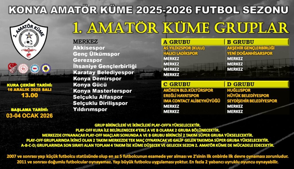 KONYA Amatör 1. Küme Futbol Ligi’nde yeni sezonun kura çekimi tarihi netleşti. Konya Amatör Spor Kulüpleri Federasyonu (ASKF) tarafından yapılan açıklamaya göre grupların belirleneceği kura çekimi 16 Aralık Salı günü saat 13.00’de Konya ASKF’de gerçekleştirilecek. 1. Küme Futbol Ligi’nde yeni sezon perdesi 3-4 Ocak 2026 tarihlerinde oynanacak maçlarla açılacak. 4 grupta 21 takımın mücadele edeceği sezon sonunda gruplarında ilk 2’i sırayı elde edecek takımlar play-off’a yükselecek ve Süper Grup’a yükselme mücadelesi verecekler. Sezonu grubun son basamağında tamamlayacak olan ekipler ise 2. Amatör Küme’ye düşecek.