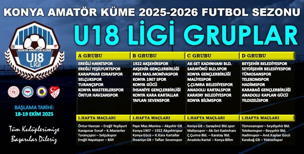 KONYA Amatör Küme 2025-2026 Futbol Sezonu U18 Ligi’nde gruplar ve fikstür belirlendi. Konya Futbol İl Temsilcisi Tahir Taşyüz başkanlığında gerçekleşen toplantı da U18 Ligi grupları ve fikstürü belirlendi. U18 Futbol Ligi, 31 takımın katılımıyla 4 grupta oynanacak. U18 Ligi’nde yeni sezon 18-19 Ekim tarihlerinde oynanacak maçlarla başlayacak. A Grubu’nda 7, B Grubu’nda 8, C Grubu’nda 8 ve D Grubu’nda da 8 takımın mücadele edeceği U18 Ligi’nde ilk haftanın maç programı ise şöyle.