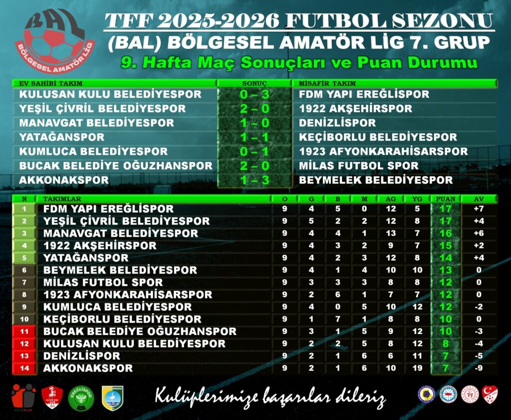 GERİDE kalan 9 hafta sonunda 5 galibiyet ve 4 beraberlik elde eden Ereğlispor, averajla liderliğe yükseldi. Kulu Belediyespor ise 8 puanla on ikinci sırada kaldı. Bir diğer Konya ekibi 1922 Akşehirspor da deplasmanda Yeşil Çivril Belediyespor’a 2-0 mağlup olarak zirveyi kaptırdı ve yarışta da önemli bir kayıp yaşadı. Denizli Yeşil Çivril İlçe Stadında oynanan maçın ilk yarısı golsüz sona ererken, ev sahibi ekip 69’da Mehmet Gülmez ve 90+8’de Ali Helvacı’nın golleriyle maçtan 2-0 galip ayrıldı. Bu sonuçla Yeşil Çivril Belediyespor puanını 17’ye çıkartarak averajla haftayı ikinci sırada tamamladı. 1922 Akşehirspor da lider girdiği haftayı 15 puanla dördüncü sırada kapattı. Diğer maçlarda alınan sonuçlar ise şöyle: Manavgat Belediyespor-Denizlispor: 1-0, Yatağanspor-Keçiborlu Belediyespor: 1-1, Kumluca Belediyespor-1923 Afyonkarahisarspor: 0-1, Bucak Belediye Oğuzhanspor-Milas Futbol: 2-0, Akkonakspor-Beymelek Belediyespor: 1-3.