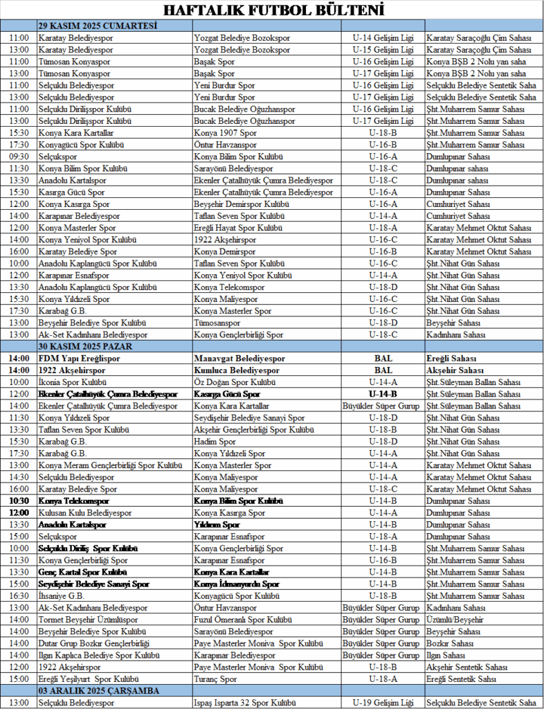KONYA’DA hafta sonu birçok ligde zorlu ve çekişmeli maçlar oynanacak. Bölgesel Amatör Ligi’nde Ereğlispor ve 1922 Akşehirspor evinde galibiyet arayacak. Süper Grup’ta şampiyonluk yarışı pazar günü yapılacak maçlarla devam edecek. U16, U14 ve U18 Gençler Liglerinde de heyecan hafta sonu yapılacak karşılaşmalarla sürecek. Konya futbolunda haftanın programı şöyle…