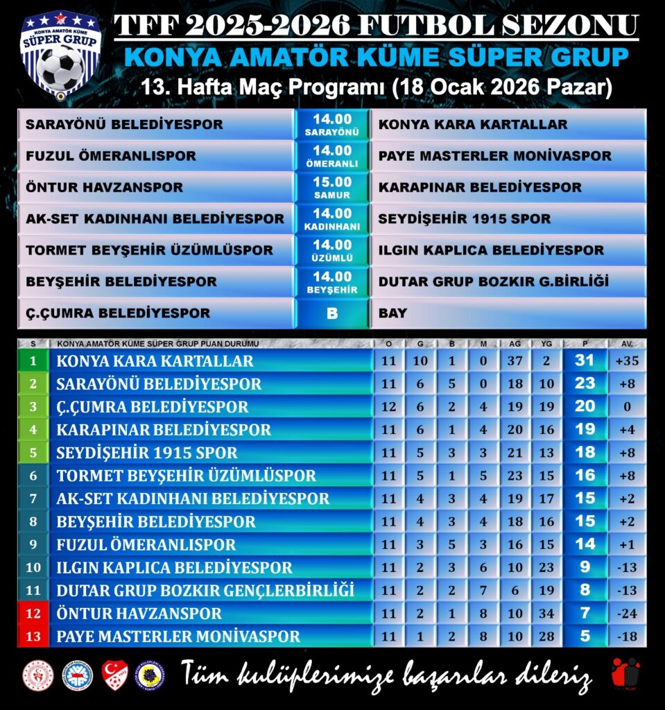 KONYA Amatör Süper Grup Futbol Ligi’nde şampiyonluk ve ligde kalma mücadelesi 18 Ocak Pazar günü oynanacak 13. hafta maçlarıyla devam edecek. Lider Konya Kara Kartallar, deplasmanda en yakın takipçisi Sarayönü Belediyespor ile karşılaşacak. Ömeranlıspor, Masterler Monivaspor’u konuk edecek. Karapınar Belediyespor, Havzanspor deplasmanında terleyecek. Ç. Çumra Belediyespor ise haftayı fikstür gereği maç yapmadan (BAY) geçecek. Haftanın maçları şöyle…