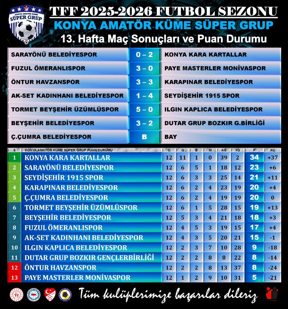 KONYA Amatör Süper Grup Futbol Ligi’nde pazar günü 13. hafta maçları oynandı. Lider Konya Kara Kartallar, deplasmanda en yakın takipçisi Sarayönü Belediyespor’u 2-0 mağlup ederek puan farkını iyice açtı ve zirvede yalnız kaldı. Konya Kara Kartallar puanını 34’e çıkarırken, Sarayönü Belediyespor 23 puanda kaldı. Seydişehir Belediyespor, Kadınhanı deplasmanında 4-1 galip gelerek haftayı üçüncü sırada tamamladı. Ç. Çumra Belediyespor’un fikstür gereği maç yapmadığı haftada fileler 26 kez havalandı. Havzanspor ve Masterler Monivaspor ise bu hafta da düşme hattından çıkamadı.