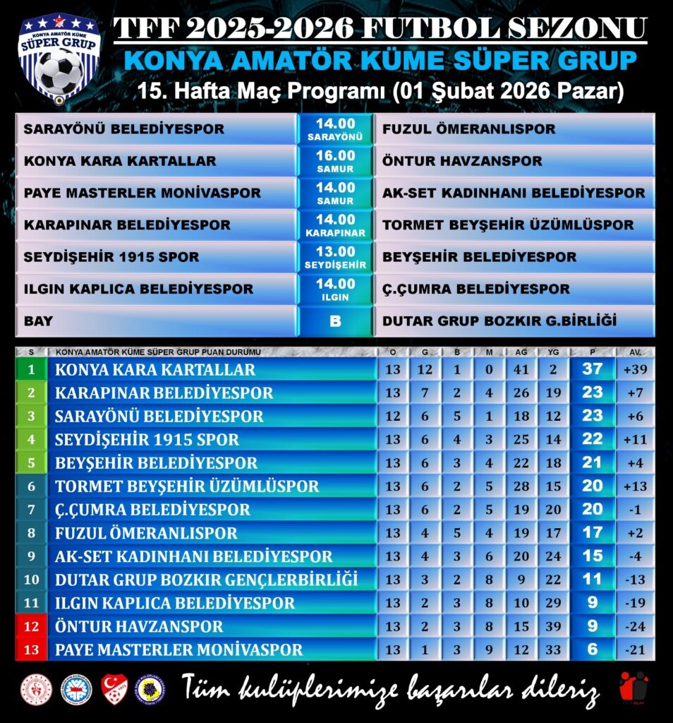 KONYA Amatör Süper Grup Futbol Ligi’nde çekişme 1 Şubat Pazar günü yapılacak 15. hafta maçlarıyla devam edecek. Lider Konya Kara Kartallar, Havzanspor’u konuk edecek. Karapınar Belediyespor taraftarı önünde Beyşehir Üzümlüspor ile karşılaşacak. Bozkır Gençlerbirliği haftayı fikstür gereği maç yapmadan (BAY) geçecek. Ligde 15. haftanın programı şöyle…