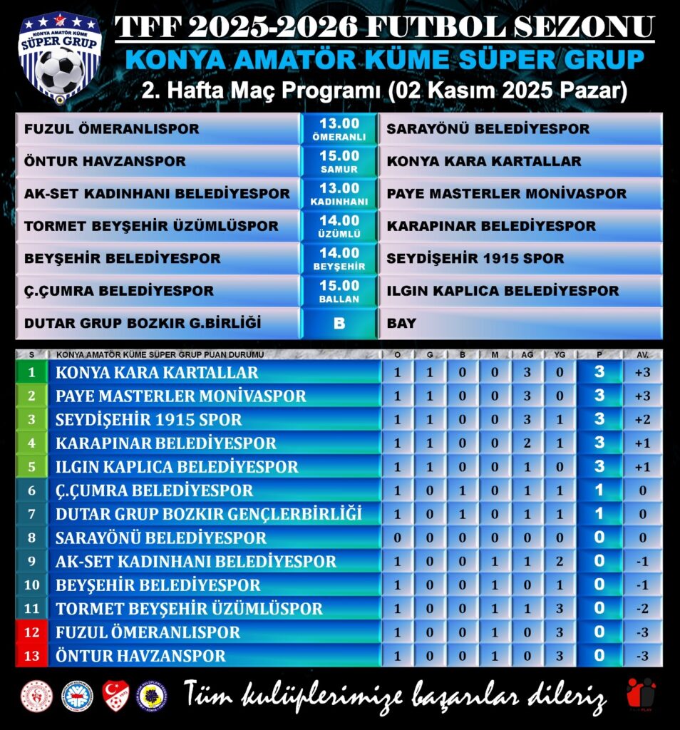 AMATÖR Süper Grup Futbol Ligi’ne 2 Kasım Pazar günü oynanacak ikinci hafta maçlarıyla devam edilecek. 2 maç merkez, 4 karşılaşma ise ilçe stadyumlarında oynanacak. Bozkır Gençlerbirliği fikstür gereği bu haftayı maç yapmadan geçirecek. 2. hafta maçlarının programı şöyle: Ömeranlıspor-Sarayönü Belediyespor, Havzanspor-Konya Kara Kartallar, Kadınhanı Belediyespor-Masterler Monivaspor, Beyşehir Üzümlüspor-Karapınar Belediyespor, Beyşehir Belediyespor-Seydişehir 1915 Spor, Ç. Çumra Belediyespor-Ilgın Kaplıca Belediyespor.