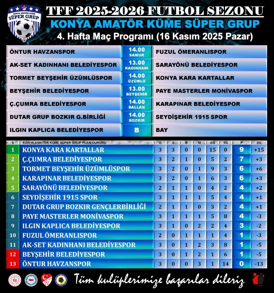 KONYA Süper Grup Futbol Ligi’nde şampiyonluk yarışı 16 Kasım Pazar günü oynanacak 4. hafta maçlarıyla devam edecek. Yarın yapılacak 6 maçın 2’si merkez sahalarda, 4’ü ise ilçe stadyumlarında oynanacak. Ilgın Kaplıca Belediyespor da fikstür gereği haftayı maç yapmadan (BAY) geçirecek. Zevkli ve çekişmeli geçmesi beklenen maçların programı şöyle: Havzanspor-Ömeranlıspor, Kadınhanı Belediyespor-Sarayönü Belediyespor, Beyşehir Üzümlüspor-Konya Kara Kartallar, Beyşehir Belediyespor-Masterler Monivaspor, Ç. Çumra Belediyespor-Karapınar Belediyespor, Bozkır G.B.-Seydişehir 1915 Spor.