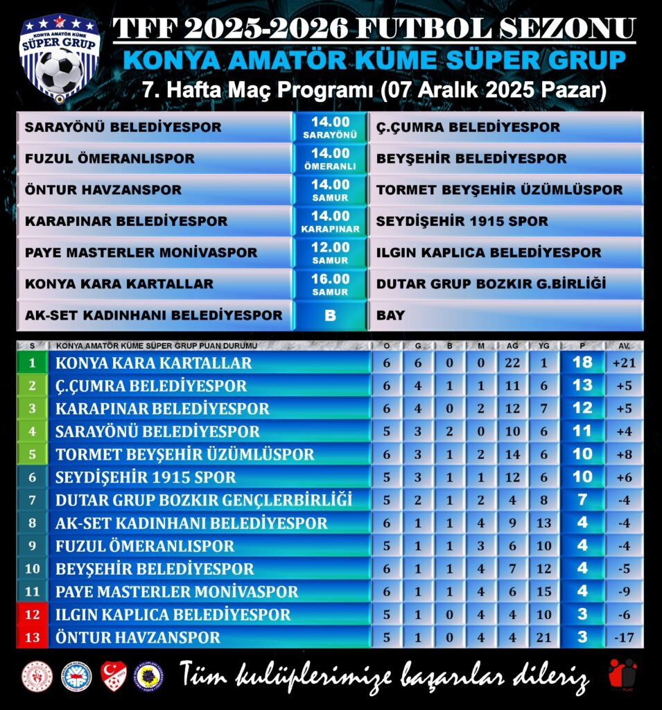 KONYA Amatör Süper Grup Futbol Ligi’nde heyecan 7 Aralık Pazar günü oynanacak 7. hafta maçlarıyla devam edecek. 6’da 6 ile zirvede yer alan Konya Kara Kartallar, taraftarı önünde Bozkır Gençlerbirliği ile karşılaşacak. Ç. Çumra Belediyespor ise Sarayönü deplasmanında terleyecek. Kadınhanı Belediyespor da fikstür gereği bu haftayı maç yapmadan (BAY) geçecek. Haftanın programı şöyle…
