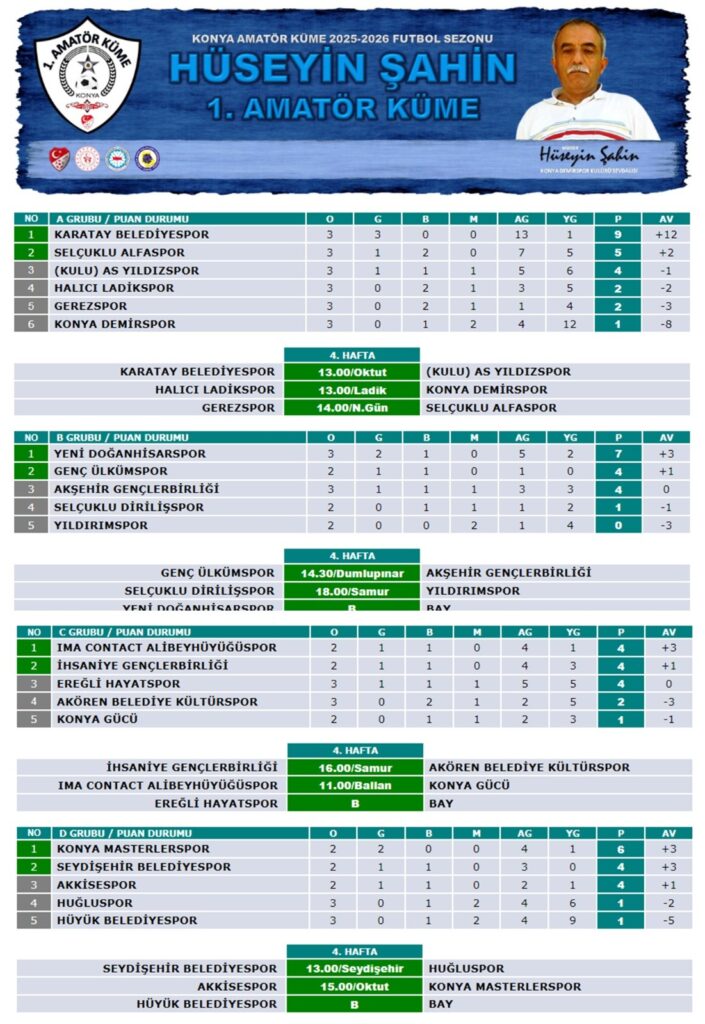 KONYA Amatör 1. Küme Futbol Ligi’ne 25 Ocak Pazar günü oynanacak 4. hafta maçlarıyla devam edilecek. Yeni Doğanhisarspor, Ereğli Hayatspor ve Hüyük Belediyespor bu haftayı maç yapmadan (BAY) geçecekler. Merkez ve ilçe stadyumlarında yapılacak maçların programı şöyle…