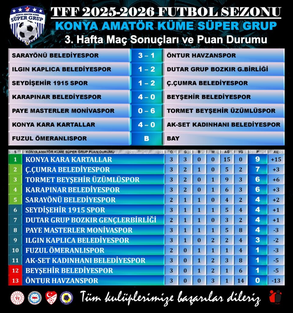 KONYA Amatör Süper Grup Futbol Ligi’nde 3. hafta geride kalırken, üç maçını kazanan Konya Kara Kartallar, haftayı lider tamamladı. Kara Kartallar evinde Kadınhanı Belediyespor’u 4-0 mağlup ederek 3’te 3 ile yoluna devam eden tek takım konumunda. Ç. Çumra Belediyespor, Seydişehir’den 3 puanla dönerek namağlup ikinci sırada yer alıyor. Karapınar Belediyespor ise sahasında Beyşehir Belediyespor’u 4-0 mağlup etti. Puanını 6’ya çıkaran Karapınar zirve yarışında hata yapmadı. 3. hafta maçlarının ardından Kadınhanı Belediyespor, Beyşehir Belediyespor ve Havzanspor yine galibiyetle tanışamadı. Ömeranlıspor’un fikstür gereği maç yapmadan (BAY) geçtiği haftada fileler 24 kez havalandı.