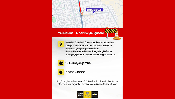Çalışmalar, 15 Ekim Çarşamba günü 00.30 – 07.00 saatleri arasında yapılacak. Yetkililer, bu süre zarfında İstanbul Caddesi’ni kullanacak sürücülerin dikkatli olmalarını ve mümkünse alternatif güzergâhları tercih etmelerini istedi.
