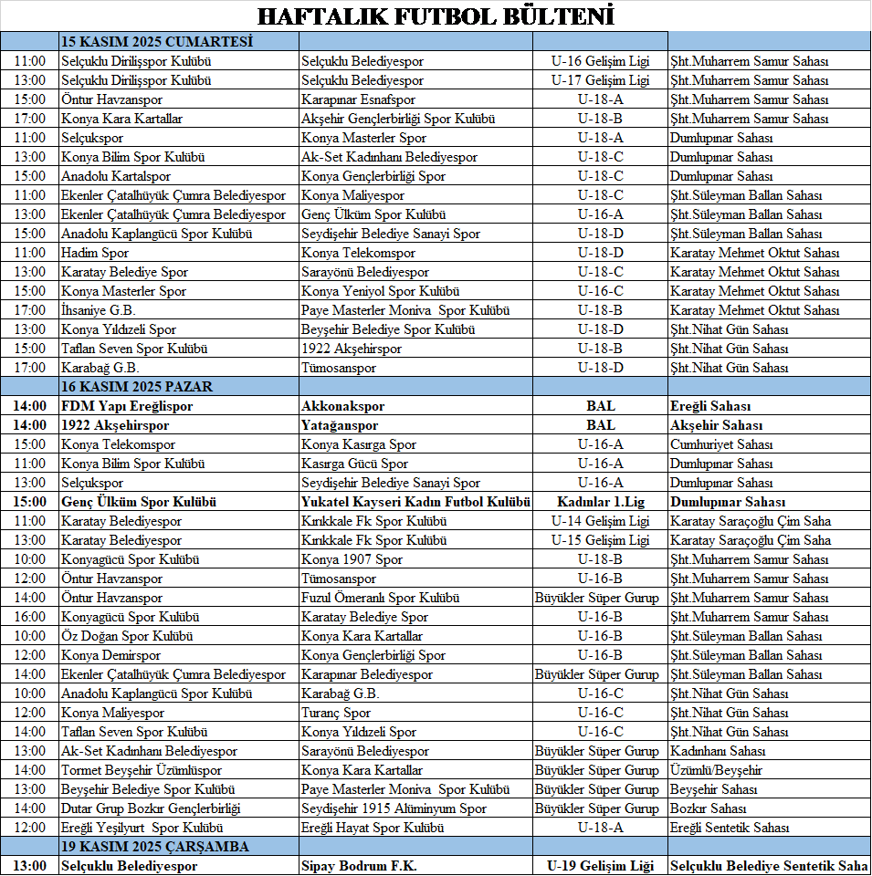 KONYA futbolunda hafta sonu dolu dolu geçecek. Amatör Süper Grup ve U18 ve U16 Futbol Liglerinde bugün ve yarın oynanacak maçlarla şampiyonluk heyecanı devam edecek. Bölgesel Amatör Lig’de ise Ereğlispor evinde Akkonakspor’u, 1922 Akşehirspor da Yatağanspor’u konuk edecek. Kadınlar 1. Ligi’nde 3’te 3 yapan Genç Ülkümspor sahasında Kayseri Kadın Futbol Kulübü ile karşılaşacak. Konya futbolunda bu hafta oynanacak maçların programı şöyle…