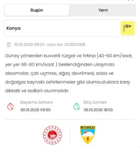Meteoroloji Genel Müdürlüğü tarafından Konya için kuvvetli rüzgar ve fırtına uyarısı yapıldı. Uyarıya göre, 30 Ocak 2026 Cuma günü saat 09.00 ile 18.00 arasında güney yönlerden kuvvetli rüzgar ve fırtına bekleniyor.