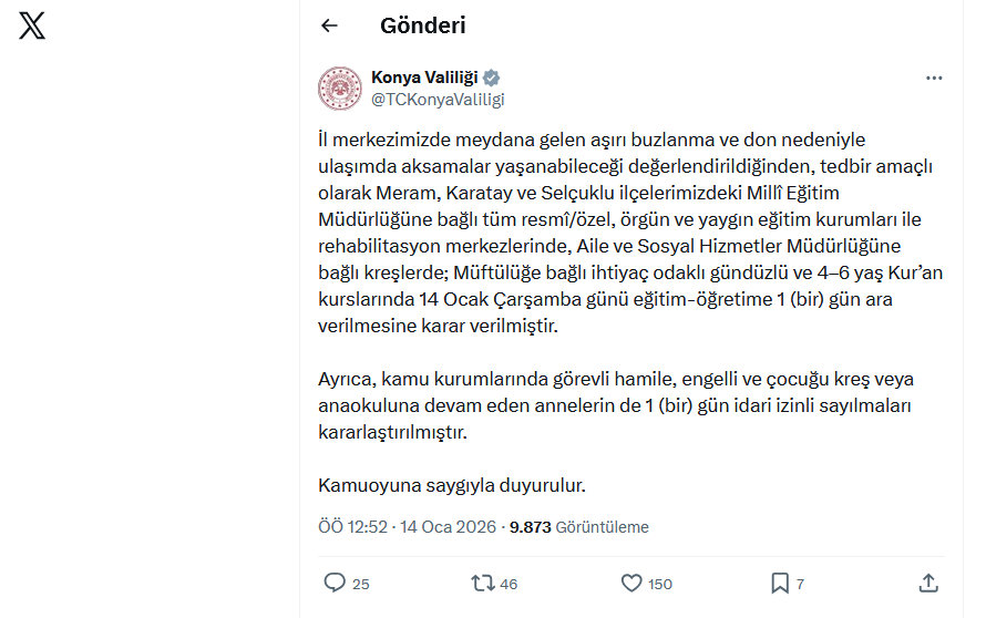 “İl merkezimizde meydana gelen aşırı buzlanma ve don nedeniyle ulaşımda aksamalar yaşanabileceği değerlendirildiğinden, tedbir amaçlı olarak Meram, Karatay ve Selçuklu ilçelerimizdeki Millî Eğitim Müdürlüğüne bağlı tüm resmî/özel, örgün ve yaygın eğitim kurumları ile rehabilitasyon merkezlerinde, Aile ve Sosyal Hizmetler Müdürlüğüne bağlı kreşlerde; Müftülüğe bağlı ihtiyaç odaklı gündüzlü ve 4–6 yaş Kur’an kurslarında 14 Ocak Çarşamba günü eğitim-öğretime 1 (bir) gün ara verilmesine karar verilmiştir.