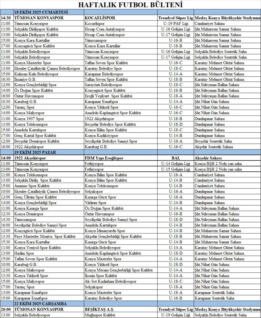 KONYA’DA hafta sonu sporla dolu dolu geçecek. Konya amatör U14 ve U16 Ligleri’nde çekişme cumartesi ve pazar günü oynanacak maçlarla sürecek. U18 Ligi’nde yeni sezon perdesi açılacak. U17 Gelişim Ligi’nde Konya derbisinde Selçuklu Belediyespor ile Konyaspor karşılaşacak. Konyaspor U14 ve U15 Takımları da Gelişim Liginde Fethiyespor’u konuk edecek. Bölgesel Amatör Futbol Ligi’nde de (BAL) Konya derbisi heyecanı yaşanacak. 1922 Akşehirspor, taraftarı önünde Ereğlispor’u ağırlayacak. Konya futbolunda haftanın programı şöyle: