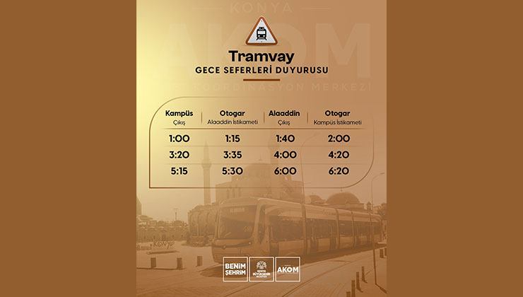 Tramvay sefer saatleri ve güzergâh detayları Konya Büyükşehir Belediyesi Mobil Uygulaması ve http://atus.konya.bel.tr adresinden takip edilebilir.