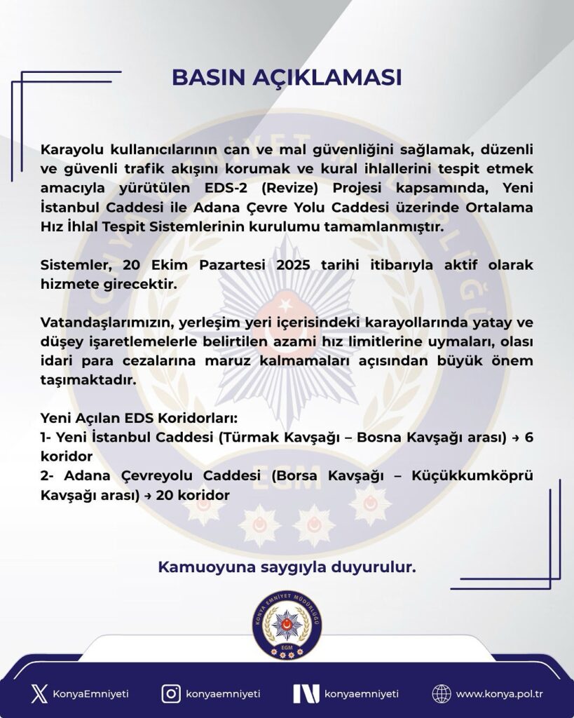 Emniyet yetkililerinden yapılan açıklamada, karayolu kullanıcılarının can ve mal güvenliğini sağlamak, düzenli ve güvenli trafik akışını korumak ile kural ihlallerini tespit etmek amacıyla EDS-2 (Revize) Projesi kapsamında yeni sistemlerin kurulduğu belirtildi. Yeni İstanbul Caddesi ile Adana Çevre Yolu Caddesi üzerinde Ortalama Hız İhlal Tespit Sistemlerinin kurulumlarının tamamlandığı ve bugün faaliyete geçtiği bildirildi. Açıklamada, sürücülerin yerleşim yeri içerisindeki karayollarında yatay ve düşey işaretlemelerle belirtilen azami hız limitlerine uymalarının, olası idari para cezalarına maruz kalmamaları açısından büyük önem taşıdığı vurgulandı.