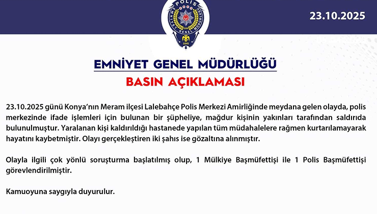 Emniyet Genel Müdürlüğü’nün ‘X’ hesabından yapılan açıklamada, ”23.10.2025 günü Konya’nın Meram ilçesi Lalebahçe Polis Merkezi Amirliğinde meydana gelen olayda, polis merkezinde ifade işlemleri için bulunan bir şüpheliye, mağdur kişinin yakınları tarafından saldırıda bulunulmuştur. Yaralanan kişi kaldırıldığı hastanede yapılan tüm müdahalelere rağmen kurtarılamayarak hayatını kaybetmiştir. Olayı gerçekleştiren iki şahıs gözaltına alınmıştır. Olayla ilgili çok yönlü soruşturma başlatılmış olup, 1 Mülkiye Başmüfettişi ile 1 Polis Başmüfettişi görevlendirilmiştir” denildi.