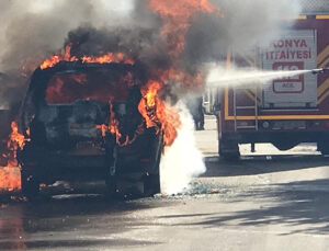 Konya’da park halindeki ticari taksi alev topuna dönerek yandı