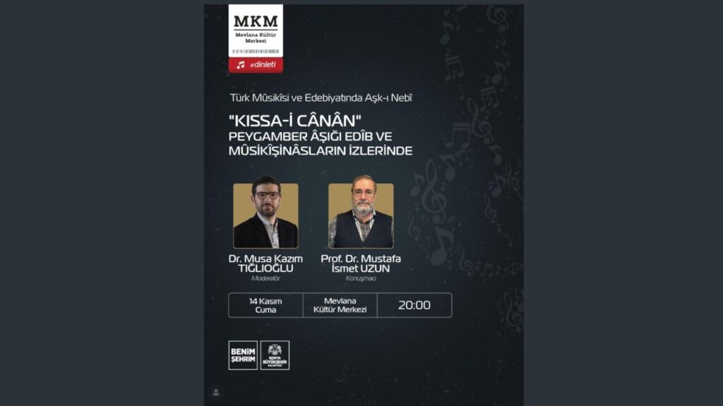 Konya Büyükşehir Belediyesi tarafından düzenlenen “Türk Mûsikîsi ve Edebiyatında Aşk-ı Nebî” temalı programlar kapsamında “Kıssa-i Cânân: Peygamber Âşığı Edib ve Mûsikîşinâsların İzlerinde” adlı söyleşi gerçekleştirilecek.