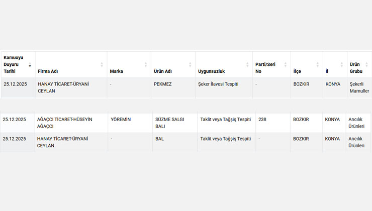 Bakanlığın 25 Aralık 2025 tarihli duyurusunda, Konya’nın Bozkır ilçesinde faaliyet gösteren o firmaların ürünlerinde uygunsuzluk görülmesi nedeniyle taklit ve tağşiş listesinde yer aldıkları açıklandı.