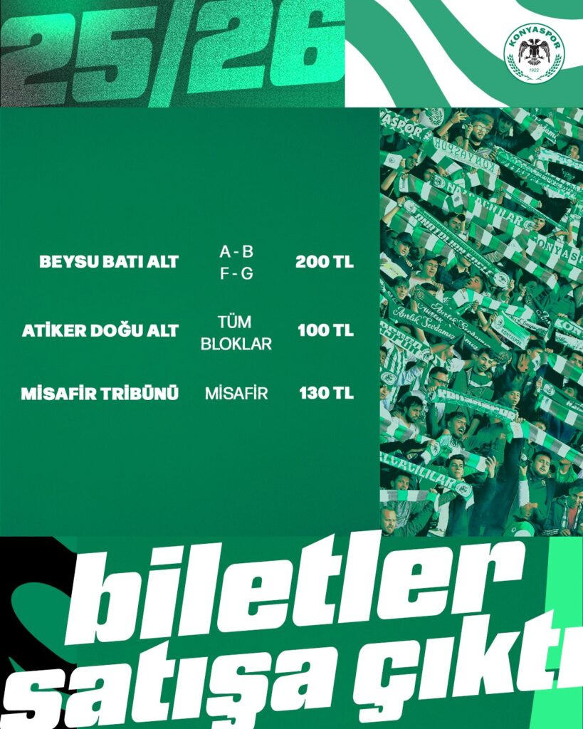 TÜMOSAN Konyaspor, Ziraat Türkiye Kupası 3. Eleme Turu’nda 12 Bingölspor’u konuk edecek. 30 Ekim Perşembe günü saat 20.30’da Medaş Konya Büyükşehir Stadyumu’nda oynanacak maçın biletleri, 27 Ekim Pazartesi günü saat 16.00 itibarıyla satışa çıktı. Bilet fiyatları 200 ve 100 TL olarak belirlenirken, misafir tribün biletleri ise 130 TL’den satışa sunuldu. Konyaspor’dan yapılan açıklamada, “Müsabakada Beysu Batı Alt ve Atiker Doğu Alt tribünleri açılacaktır. Ziraat Türkiye Kupası karşılaşmalarında 2025-2026 kombineleri geçerli değildir. Refakatçisi bulunan engelli taraftarlarımız aynı yerlerinde bulunacak, refakatçisiz engelli taraftarlarımızın bilet yüklemeleri Doğu Alt tribünden yapılacaktır. Karşılaşmanın biletlerini http://passo.com.tr ve Passo gişelerinden alabilirsiniz” ifadelerine yer verildi.