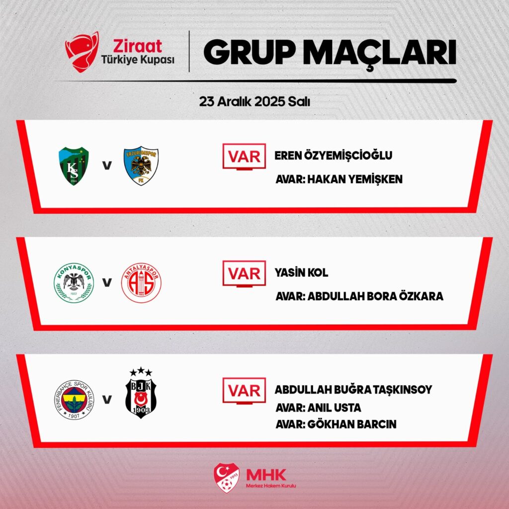 ZİRAAT Türkiye Kupası grup aşaması ilk hafta maçında bugün saat 17.30’da oynanacak Konyaspor-Antalyaspor maçının VAR hakemi açıklandı. TFF Merkez Hakem Kurulu’ndan yapılan açıklamaya göre VAR koltuğunda Yasin Kol oturacak. Abdullah Bora Özkara ise AVAR hakemi olarak görev yapacak.