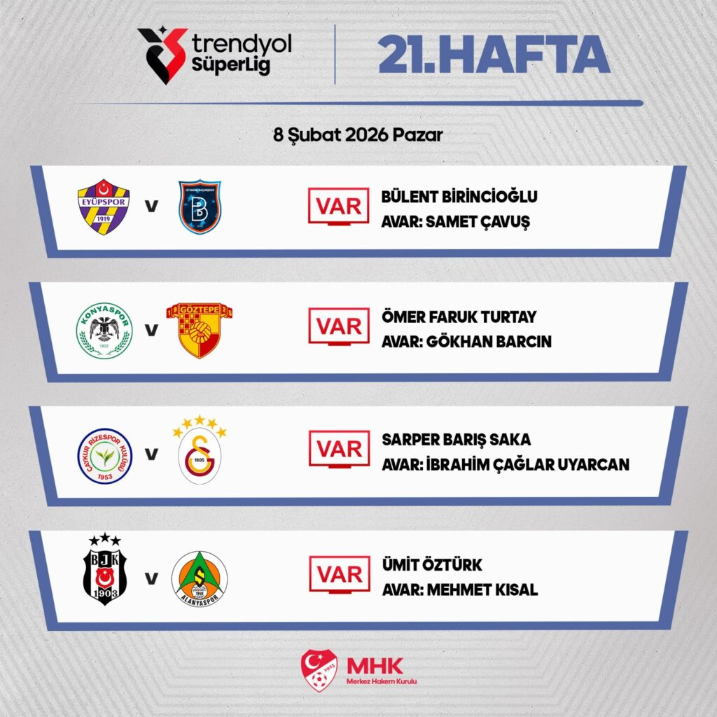 SÜPER Lig’de bugün saat 17.00’de oynanacak Konyaspor-Göztepe maçının VAR hakemi açıklandı. Türkiye Futbol Federasyonu (TFF) Merkez Hakem Kurulu’ndan yapılan açıklamaya göre kritik maçın VAR koltuğunda Ömer Faruk Turtay oturacak. Gökhan Barcın ise AVAR hakemi olarak görev yapacak.