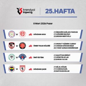 SÜPER Lig’de 25. hafta maçlarında düdük çalacak hakemler açıklandı. TFF Merkez Hakem Kurulu’ndan yapılan açıklamaya göre pazar günü saat 16.00’da Medaş Büyükşehir Belediye Stadyumunda oynanacak Konyaspor-Kasımpaşa mücadelesini İstanbul bölgesi hakemi Ümit Öztürk yönetecek. Öztürk’ün yardımcılığını Bahtiyar Birinci ve Hüseyin Aylak yapacak. Burak Olcar ise dördüncü hakem olarak atandı. Ümit Öztürk, daha önce birçok kez Konyaspor maçlarında görev alırken, verdiği-vermediği kararlarla eleştirilerin odağında olmuştu. Süper Lig’de pazar ve pazartesi günü oynanacak maçlarda görev alacak hakemler şöyle…