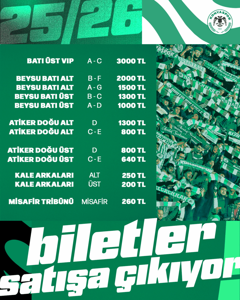 18 Ekim Cumartesi günü saat 14.30’da MEDAŞ Konya Büyükşehir Stadyumu’nda oynanacak maçın biletleri satışa çıkıyor. Karşılaşmanın biletleri, 15 Ekim Çarşamba günü saat 11.00 itibarıyla satışa sunulacak.