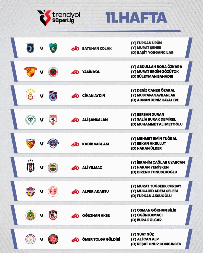 TRENDYOL Süper Lig’de 11. hafta maçlarını yönetecek hakemler açıklandı. TFF Merkez Hakem Kurulundan yapılan açıklamaya göre Konyaspor-Samsunspor mücadelesini Çanakkale bölgesi hakemi Ali Şansalan yönetecek. Bersan Duran ve Salih Burak Demirel ise yardımcı hakem olarak görev yapacaklar. Muhammet Ali Metoğlu da dördüncü hakem olarak atandı.
