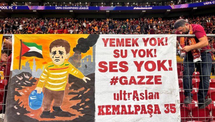 Öte yandan Galatasaray taraftarları, İsrail’in işgali ve soykırımı altındaki Filistin’e desteğini yineledi.