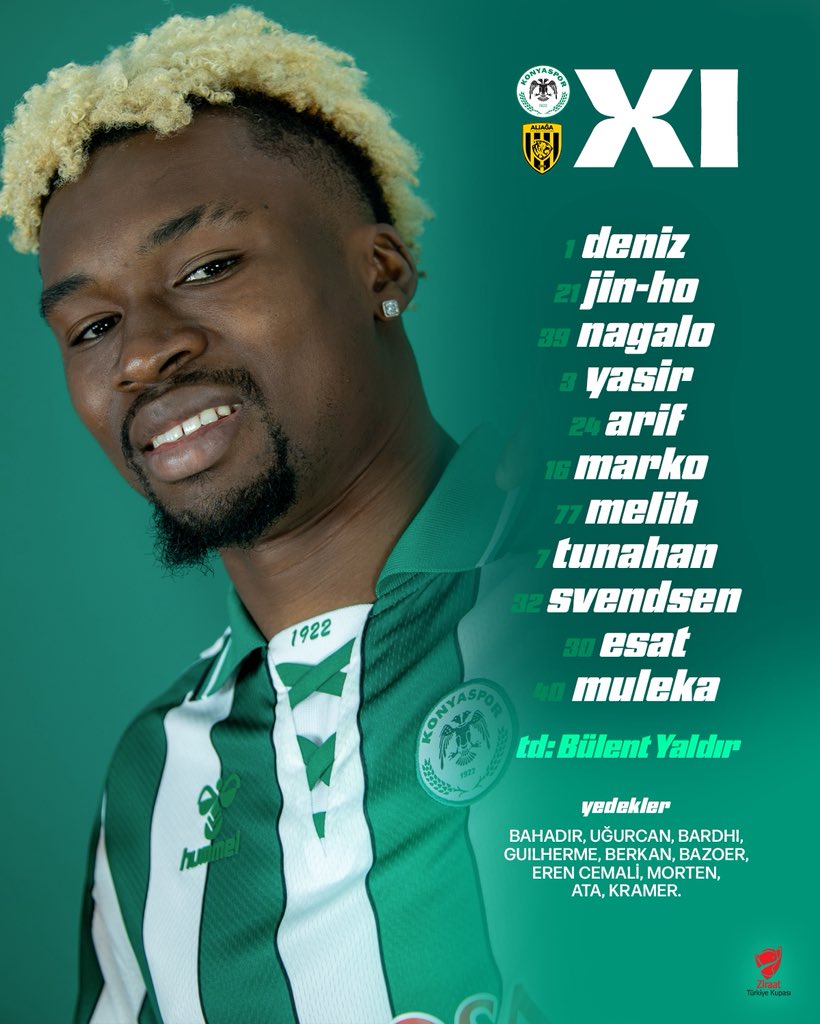 TÜMOSAN Konyaspor, Türkiye Kupası B Grubu 3. hafta maçında bugün saat 15.30’da Aliağa Futbol ile karşılaşacak. Medaş Büyükşehir Belediye Stadyumunda oynanacak müsabakaya yeşil-beyazlı temsilcimiz şu 11 ile çıkacak: Deniz, Jin-Ho-Jo, Nagalo, Yasir, Arif, Jevtovic, Melih İbrahimoğlu, Tunahan, Svendsen, Esat, Muleka. Konyaspor, teknik direktör Çağdaş Atan’ın görevine son verilmesi nedeniyle bugünkü maça altyapı antrenörü Bülent Yaldır yönetiminde çıkacak.