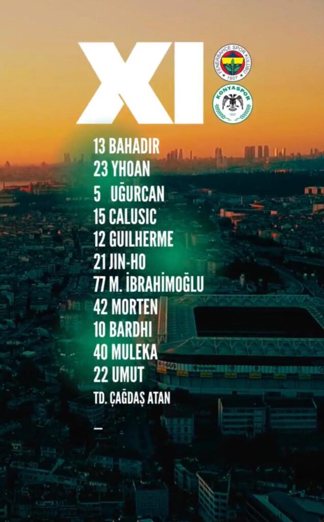 Trendyol Süper Lig’in 16. Hafta maçında Fenerbahçe ile karşılaşacak olan Tümosan Konyaspor’un ilk 11’i beli oldu. Yeşil-beyazlı temsilcimiz maça şu 11 ile çıkacak: Bahadır, Yhoan, Uğurcan, Calusic, Guilherme, Jin-Ho, Melih İbrahimoğlu, Morten, Bardhi, Muleka, Umut Nayir.