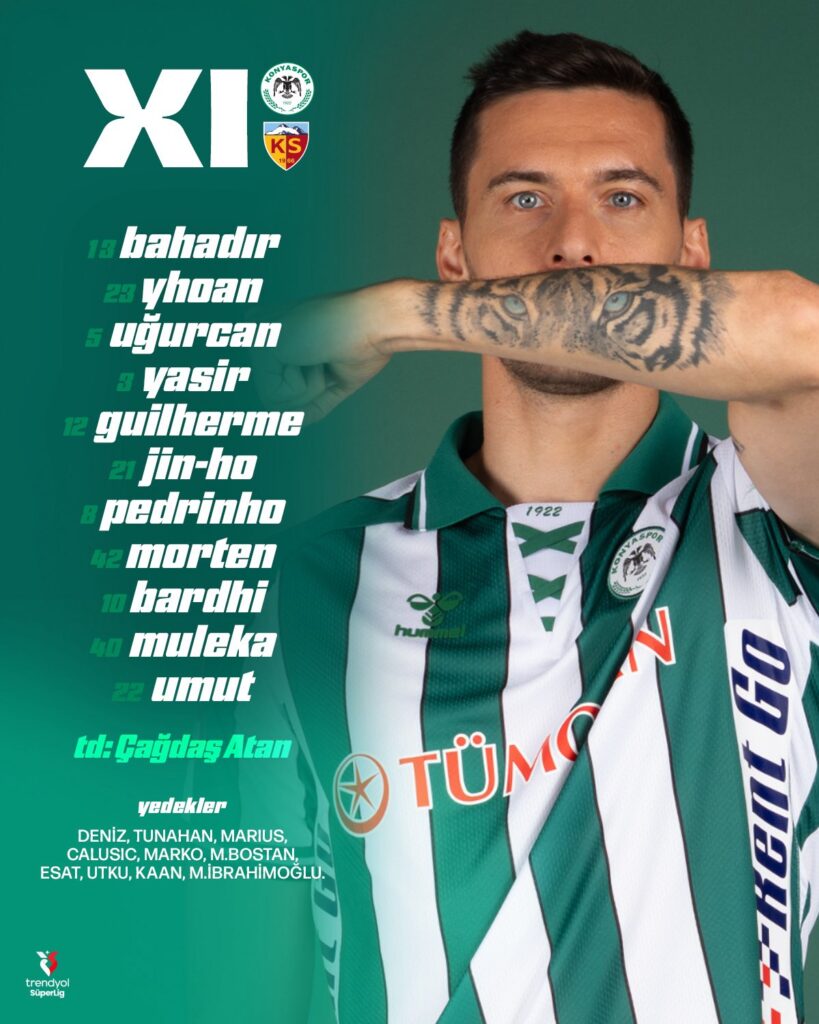 SÜPER Lig’de ilk yarının son haftasında bugün saat 14.30’da Kayserispor ile karşılaşacak olan Konyaspor’un ilk 11’i açıklandı. Yeşil-beyazlılar maça Bahadır, Yhoan, Uğurcan, Yasir, Guilherme, Jin-Ho, Pedrinho, Morten, Bardhi, Muleka ve Umut Nayir 11’i ile çıkacak.