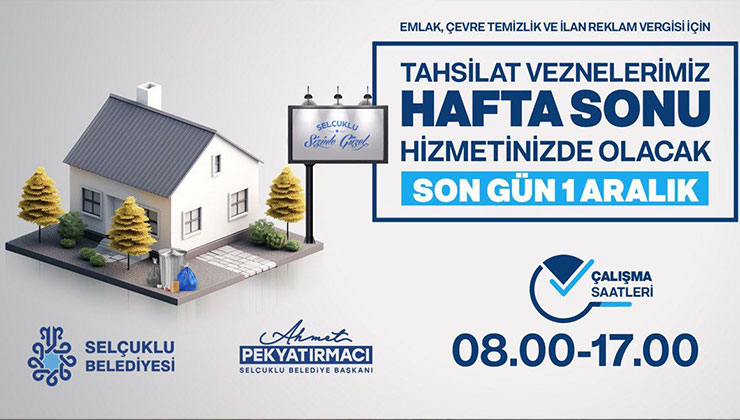 ·Selçuklu Belediyesi hizmet binasında yer alan tahsilat vezneleri vergilerini ödemek isteyen mükellefler için hafta sonu da hizmet verecek.