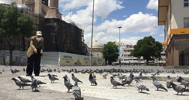 Konya’dan içinizi ısıtacak kareler… Cemal dedenin pazar günleri güvercin yemlemekle geçiyor